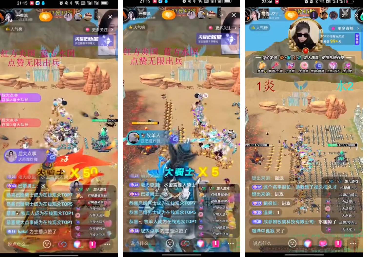 1. 概述 炎与水之国是一款战争风格的对抗类型玩法,角色画风参考电影《指环王》中的兽人族与矮人族的对战风格。玩法当中观众化身大将军带领自己的部队进行战斗,同其他将领在炎与水的战场上斗智斗勇,极限消耗对方的兵力,体验史诗级战场的刺激。 2. 玩法规则观众输入【炎】【1】或【水】【2】后会自动生成一个基础军队,通过点赞、评论、礼物进行战前军队部署。可以通过【进攻】【撤退】进行部队的控制,通过实时的操作,极限消耗对方阵营的兵力。游戏正上方为攻守方识别,游戏开始时,系统随机分配炎国、水国为进攻防守方。在规定时间内,进攻方未攻下防守方,则攻守方进行转换;若攻守方转换后,攻方未进攻下守方,则守方获得胜利。 玩法中请暂时先选用沙漠地图、沙漠地图、沙漠地图!森林地图暂时还在优化中! 请主播根据直播间人数进行基地血量值、游戏时间的设置。 1-10人直播间,基地血量值2000,时间300s; 10-50人直播间,基地血量值20000,时间600s; 50人直播间以上,基地血量值50000,时间900s;本游戏玩法策略,鸡腿手、执盾手、长矛手作为前排进攻,后排大法师进行技能收割兵种,羊骑士/狼骑士进行破阵,大龙进行场控。