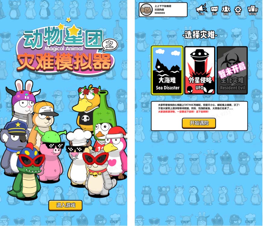 主播通过选择不同的灾难,开启观众的求生之旅。目前过审设计制作中的子玩法有《大海难》、《外星侵略》、《生化灾难》。《大海难》玩法是观众在邮轮沉没之后,选择漂浮物对抗鲨鱼及各种怪物生存到最后。《外星侵略》玩法是观众在规定时间内躲避外星人攻击活到最后即可活动胜利。《生化灾难》玩法是观众选择不同的战车躲避生化怪物的追击和清除道路阻碍逃出升天即可生存下来。当前已开发《大海难》玩法。