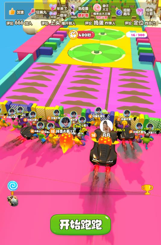 《超能跑跑》是3D多人竞速对战类直播互动玩法,上场参与的玩家角色随机生成,种类多达百万种形象!观众输入指定评论生成带观众头像和昵称的随机魔性3D角色,主播开始玩法后,玩家往终点奔跑。过程中会遇到多个趣味关卡和道具,玩家通过评论&点赞、礼物加速奔跑、减速其他角色,最终目标是到达终点。