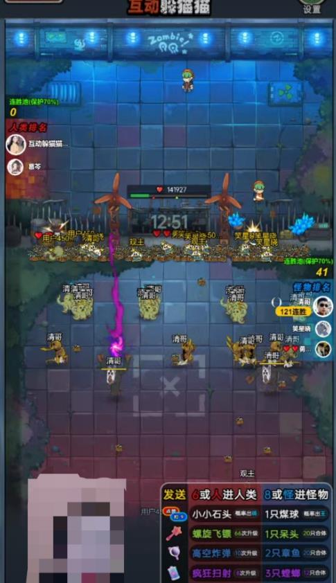 “互动躲猫猫”是一款简单有趣的互动小玩法,直播间观众输入指定评论字段加入人类阵营或者怪物阵营,通过点赞和礼物指令,人类阵营保护房间,怪物阵营进攻房间,在规定时间内,若成功守住房间,则人类阵营获胜,反之则怪物阵营获胜。